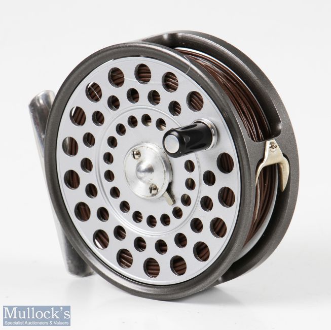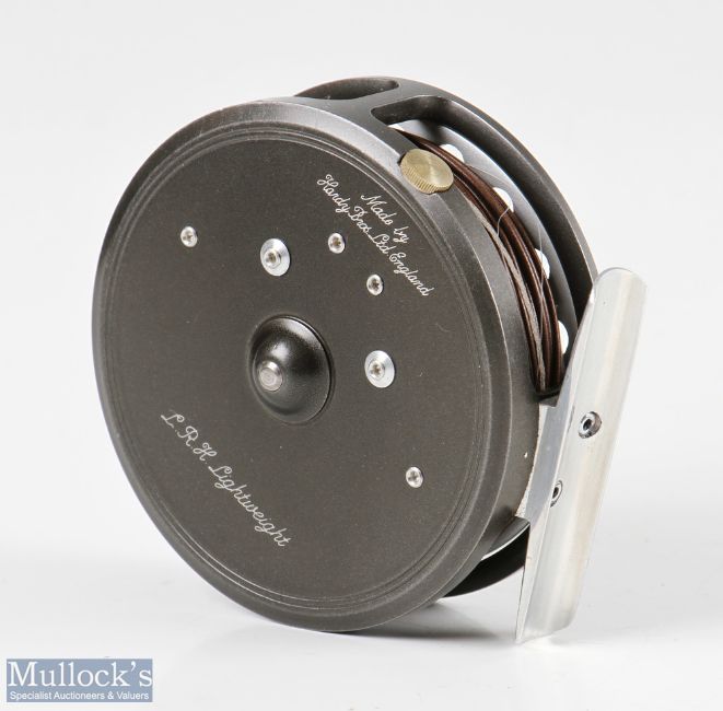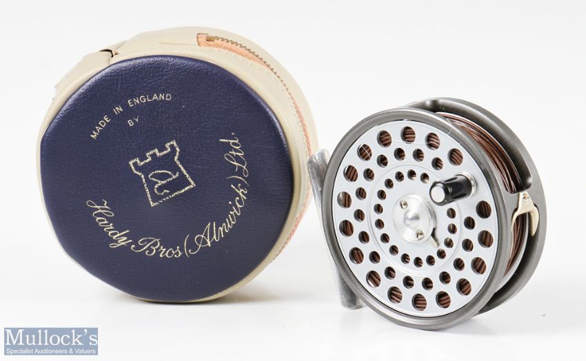 Hardy Bros England LRH Lightweight 3 1/8” alloy fly reel with smooth alloy foot, with line guide, rim tensioner, loaded with line, appears in very good condition overall, with make’s zip case