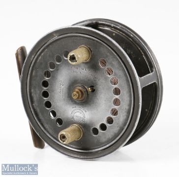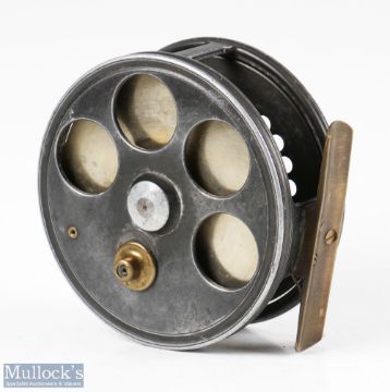 C Farlow & Co London ‘The Barrett Spinning Reel’ 4” alloy drum reel with Holdfast Logo, four finger brake holes to rear plate, on/off check, smooth brass foot, quick release drum, period line, runs well, light surface wear as expected, good example overall with good clear logo details