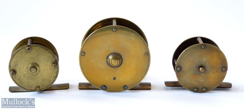 Anderson Maker Dunkeld and 2x other brass winches – fine Anderson 2.75” crank wind reel with curved arm, black horn handle, constant check – all original – runs well: and 2x unnamed 2” wide drum reels both with curved crank handles (one with the black knob slides off) – both with no checks.