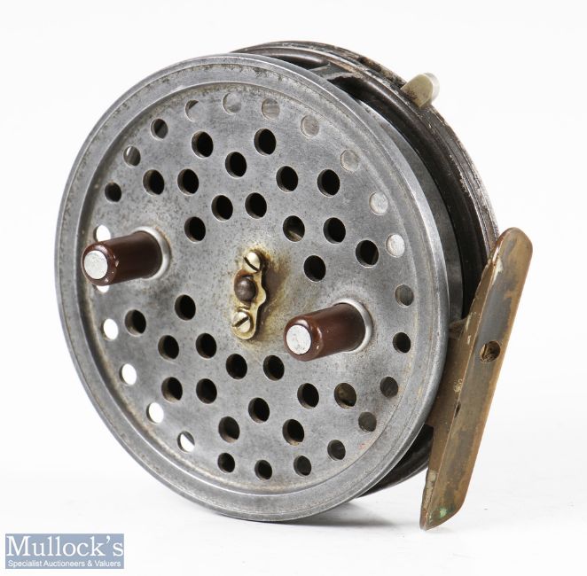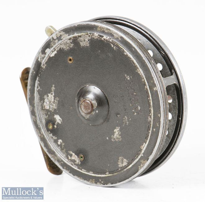 Hardy Bros England Eureka 3 ½” alloy centrepin reel with ribbed brass foot, rim on/off check lever, twin handled, surface wear apparent, runs well otherwise