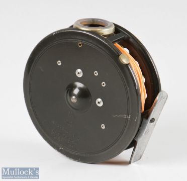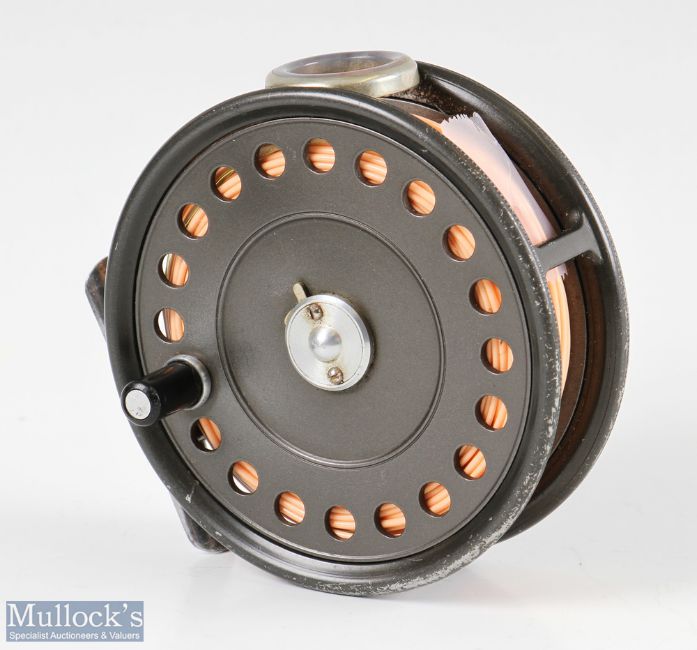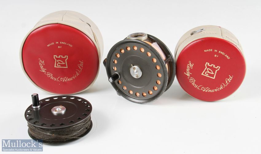 Hardy Bros England St George 3 ¾” Mk II alloy fly reel and spare spool with agate line guide, rim tensioner, runs smooth, very light surface wear, with maker’s zip cases (2)
