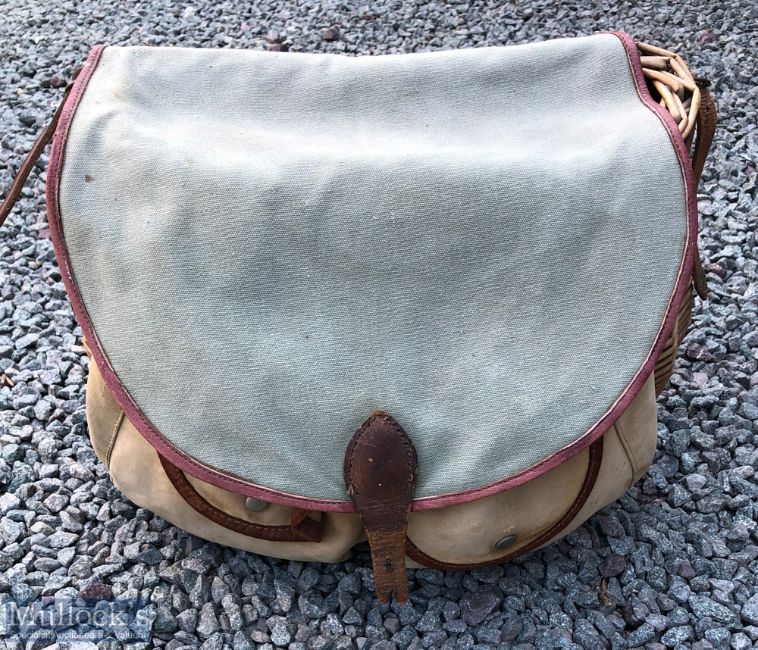 Brady canvas and reed fishing creel/bag with reed structure and canvas pockets and top, with leather and canvas shoulder strap, missing part of front strap A/G overall, measures 40x29x15cm approx.