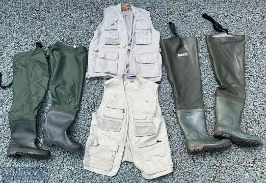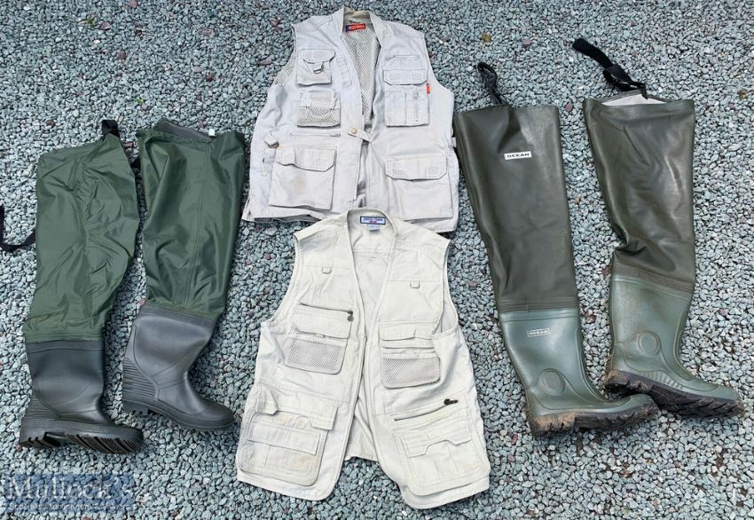 Fishing Waders and Vests – pair of Ocean waders, size 10, with another unnamed pair size 9, Dress Town, York fishing vest in size XXL with a similar Klobba vest in size L (4)