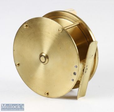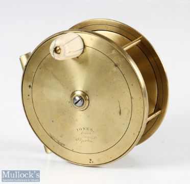 Victorian Jones Maker 111 Jermyn Street London 4 ½” all brass Salmon fly reel stamped with early fish logo to base of foot, maker’s detail to face plate, white handle, strong constant check, nice example o/w