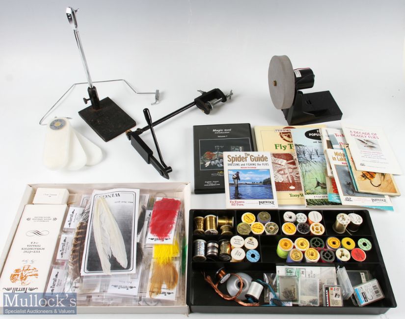 Mixed Collection of Fly Tying Tools and Materials incl Turrall Fly Tying kit with vice, tools and materials, plus 2 vices, boxed rotary dryer, mixed fly tying tools, assorted threads, tinsel and wires, instruction book etc (Box)