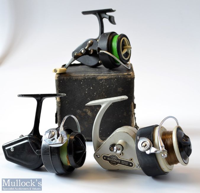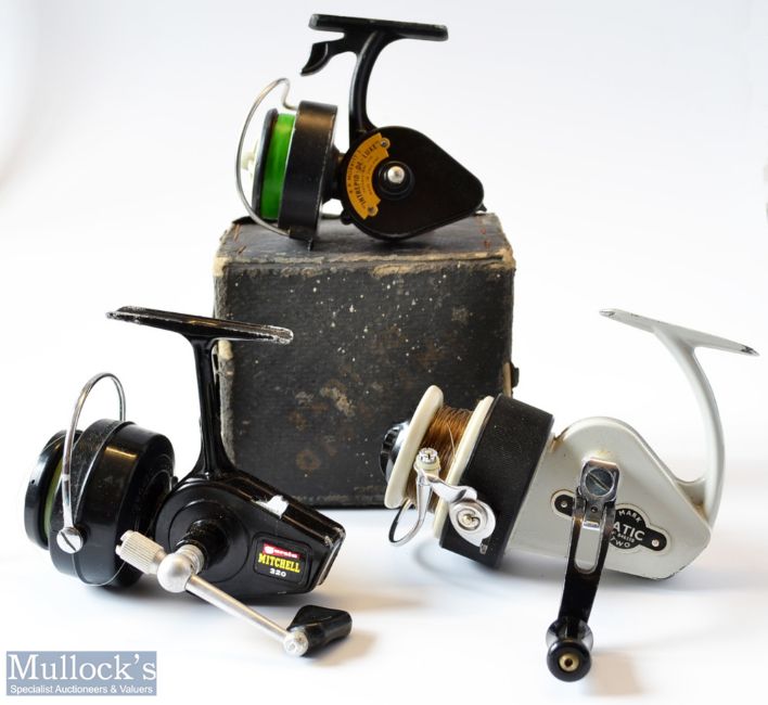 3x Spinning reels - Fine Allcocks Delmatic Mk Two fixed spool reel – LHW, folding handle, retaining most of the original finish; Mitchell 320 stamped France to the foot c/w serial no 0681765, and also to the spool Model Depose Brevete SGDG, France – some slight paint wear to the under housing and to the end of the foot ; and a boxed K.P. Morritt’s Intrepid De-Luxe c/w makers guarantee and instruction leaflets