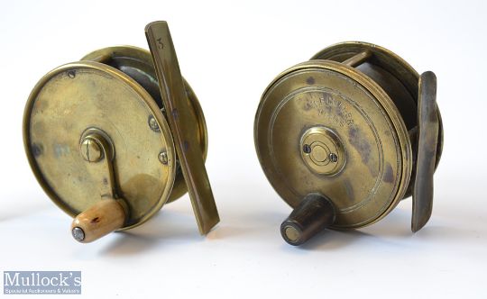 2x interesting brass fly reels – unnamed 2.5” brass crack wind with anti-foul rim, good long smooth brass foot stamped 3 to one end, constant check runs smoothly; and J E Miller Leeds 2.5” brass plate wind – some kinks to the foot, some slight play – no check.