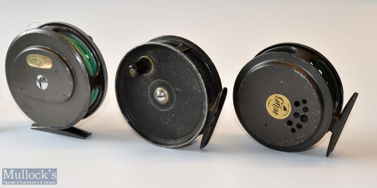 3x various fly reels - Allcocks Popular 3.5” trout fly reel black bobble finish constant check runs smoothly; Intrepid 3.5” Rimfly c/w line (G); and The Gnat 3.25” with constant check, quik drum release latch comes with Airflo DT8F line (G)