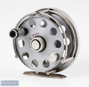 Fine Ari't Hart International B.V. Round II 2 ¾” trout fly reel RH wind, silver finish, in as new condition with spare spool, maker’s leather pouch and card box