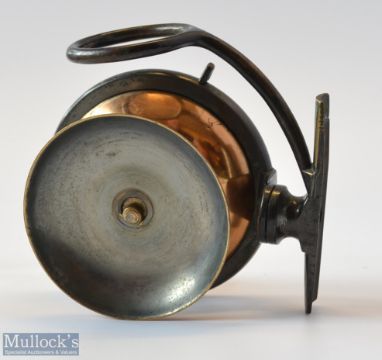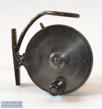 Fine Mallochs Perth Patent Brass Sidecasting Salmon Reel – 3.5” dia spool x 4” dia back plate, quick release reversible drum, on;/off rim check lever, made without the sliding locking system and retaining most of the original bronzed lacquered finish – very neat rectangular filing to the front foot 9mm only professionally done.