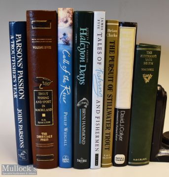 Assorted Fishing Book Selection to include Trout Fishing and Sport in Maoriland ltd ed copy, Call of the River, Parson’s Passion, Rod Fishing in New Zealand, Black Gnat, Fisherman’s Paradise, and Parson’s Pleasures (Mostly of the Fishing Kind) – all but one HB issues (8)
