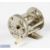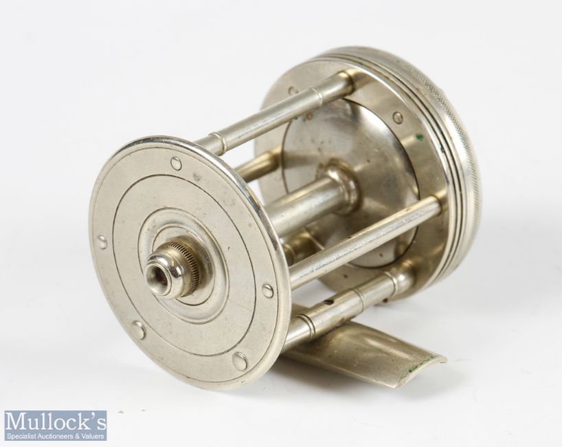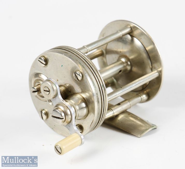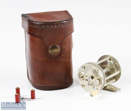 Fine B F Meek & Sons Louisville, Kentucky No2 multiplier reel in nickel silver measures 1 3/4” x 2” spool width, stamped 3440 to the foot, with counter balance handle, on/off check, five pillar construction, appears in very good condition overall comes with period leather case, plus a triple arm handle marked Pat to reverse