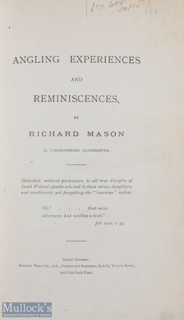 Mason, Richard – “Angling Experiences and Reminiscences” limited edition of 600 copies c1900, published by Great Grimsby, spine worn with some discolouring to boards