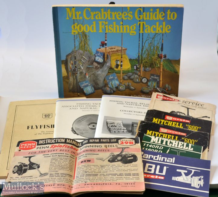 Collection of various fishing books and reel makers operating and parts booklets (10) - Daily Mirror “Mr Crabtree’s Guide to good Fishing Tackle” publ’d 1969 in the original pictorial wrappers incl various colour plates of fishing reels, flies and lures et al; 6x various makers reels manuals to incl 1966 Penn catalogue no. 29B with punch holes some oil marks; 4x Garcia Mitchell parts and operation leaflets ; and Abu Garcia Cardinal booklet; 1983 Summer Fly Fishers Journal and to Christies Scotland catalogues from April 1989 and September 1991 pen