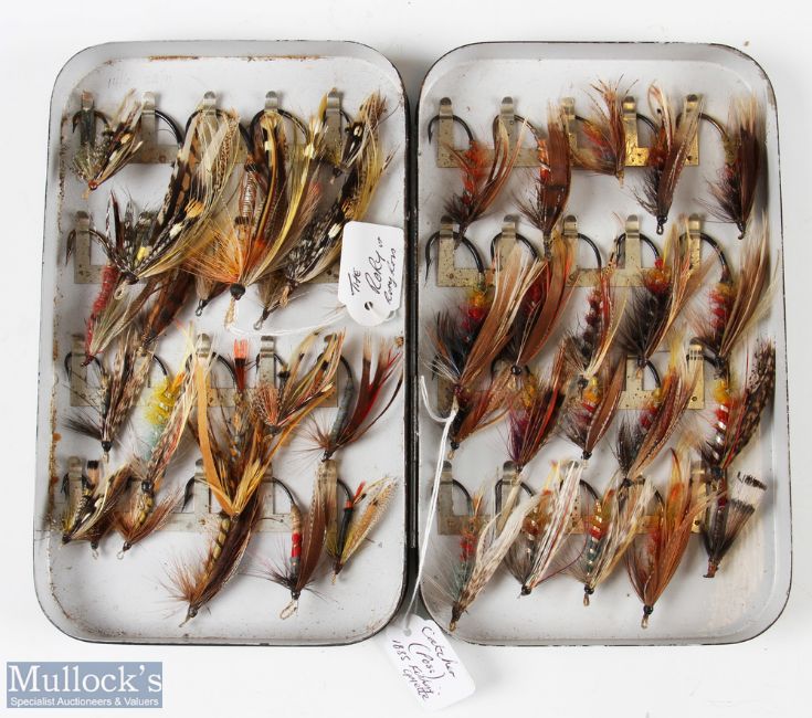 Fine Forest & Sons, Kelso Black Japanned Fly Box and Gut Eyed Salmon Flies – 41 traditional salmon flies in sizes 1” to 3”, housed in leaf clip holders, 2 larger flies having tags “The Rory” and “Catcher (poss) 1885 Fishing Gazette), tin is in good condition with little wear and markings
