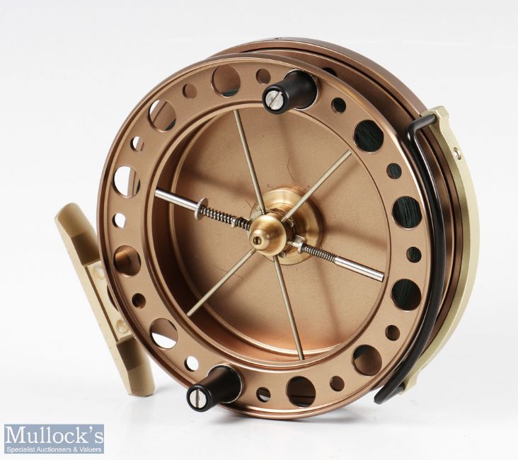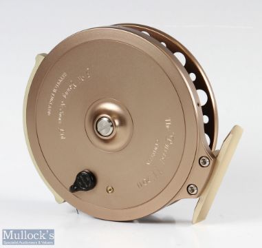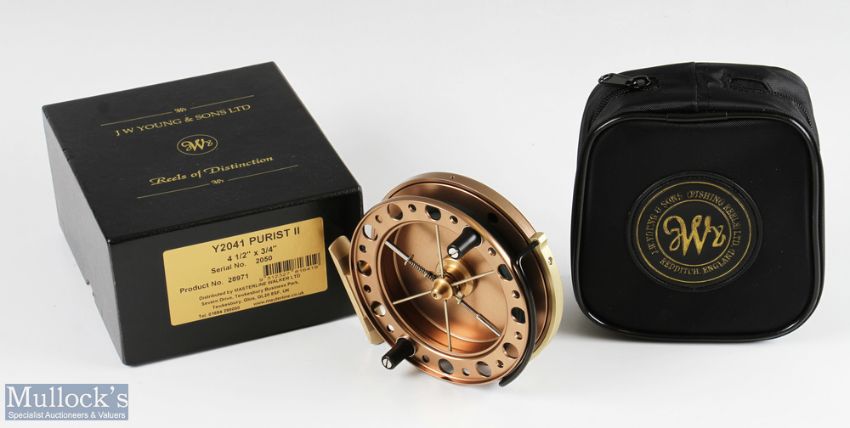 J W Young & Sons Purist II 2041 4 ½” centrepin reel with twin handle, Bickerdyke line guide, marked SR 2050 internally, appears unused, with case, box and papers