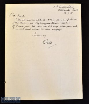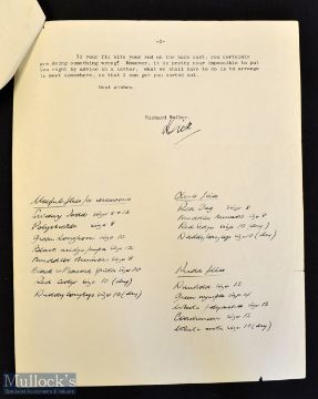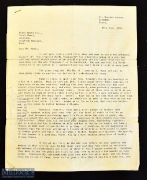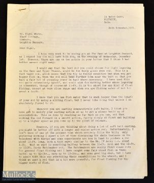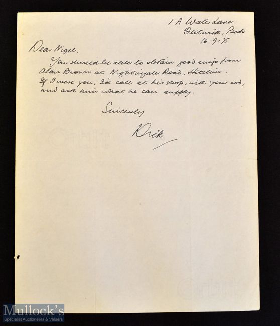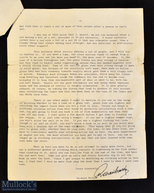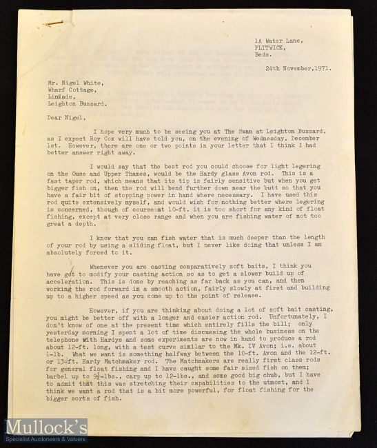 Richard Walker (b.1918 – d.1985) Archive of Fishing Letters 1969-1979. An incredible collection of 22x detailed letters covering all aspects of fishing including rods and their construction and lots more advice - typed and hand signed from Richard Walker/Dick - all written to Nigel White, Linsdale Leighton Buzzard with address from 1969 – November 1971 - after then written to Nigel (no address). First three letters signed in ink Richard Walker June 1969 to January 1970 – then becoming more personal and signed Dick in ink. See 16/9/75 hand written in ink and signed Dick. See 17th July 1970 hand drawn centre piece landing net casting. See 22nd July 1970 hand drawn plan of Rackley Pool and where to fish for carp from, plus 3x sketches of simple canvas fishing shelters incl one used by Fred Taylor. See 27th April 1971 hand written details of useful flies for Reservoir (10x plus sizes); and 4x flies for Chub, and 5x flies for Rudd again incl sizes. See 6th May 1971 signed in Dick Walker’s Absence. Contents deal with different rods for different fishing, how where to fish, et al – for detailed information go to - www.mullocksauctions.co.uk