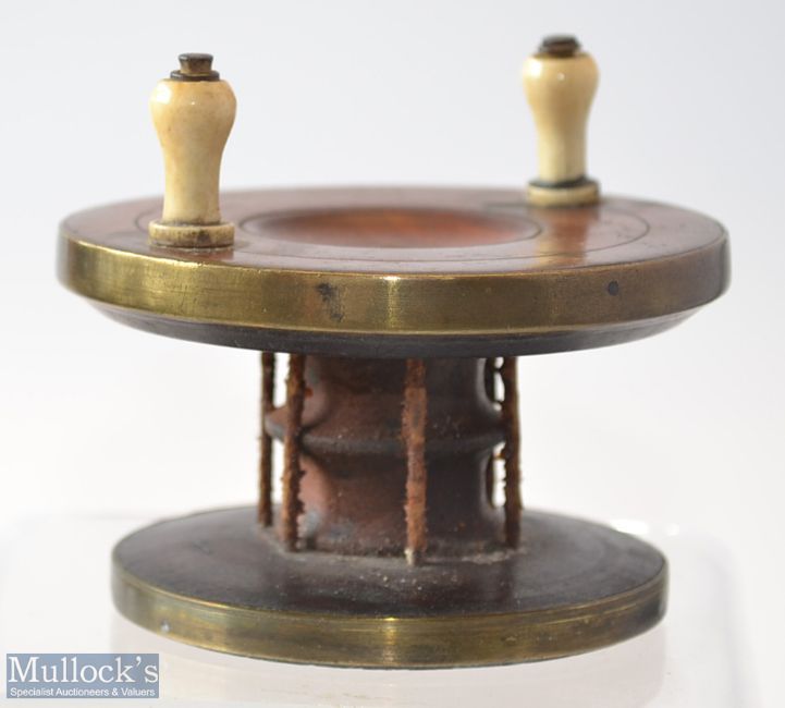 Rare and early Brass Bound Nottingham Wide Drum 3.25” Winch – with 6x iron pillar drum core with chamfered edges, concealed with removable parchment lining, twin shaped bone handles (see rear of the face plate hairline crack through the handle pin – not visible on the front), iron spindle, solid brass strap back held in place by 4x metal pins and spindle, c/w brass raised peak fitted with an offset brass foot secured by 3x metal pins (possibly shortened) – the drum is held in place with heavy milled brass retaining nut - in amazing condition for reel approx 170 yrs old. See Stefan Dumas Men of Trent p.37-40 for similar construction