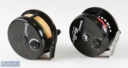 Scientific Anglers System Two 1011 Salmon fly reels in black finish, counter balance weights, rear drag adjuster, loaded with line, appear in almost unused condition (2)