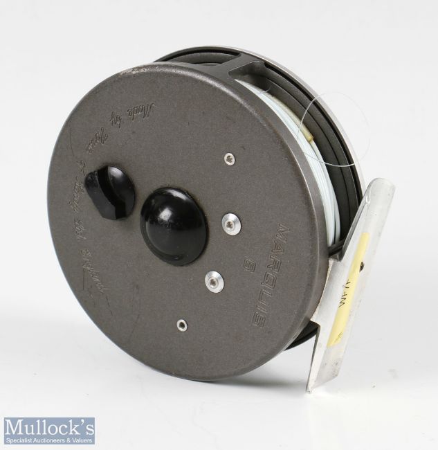 Hardy Bros England Marquis #6 alloy trout fly reel and spare spool with alloy smooth foot, line guide, loaded with line, light signs of use, appears good, with maker’s zip case (2)