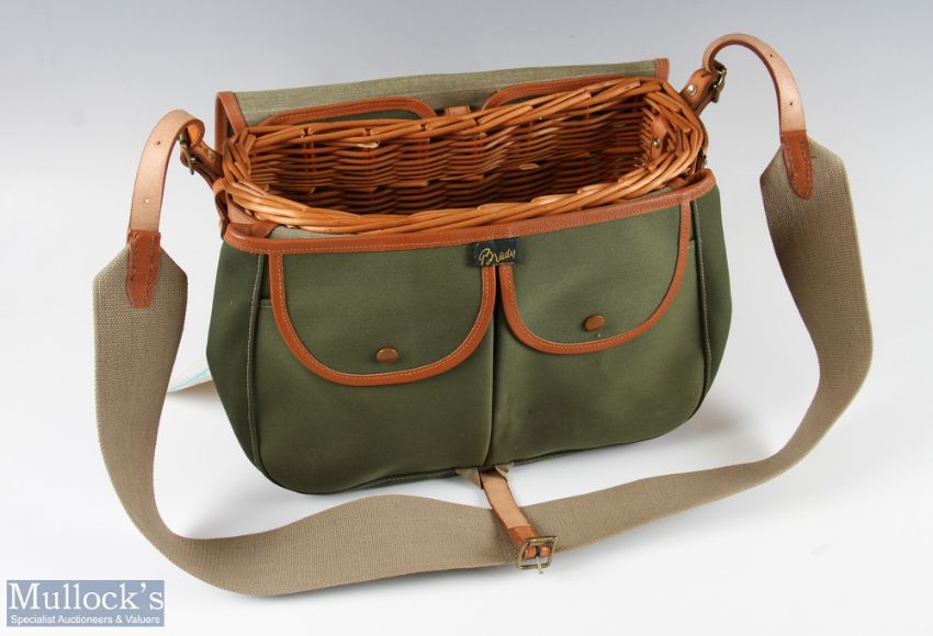 Brady Conway Fishing Creel Bag – willow basket with canvas bag front having 2 pockets and over flap, with leather fittings plus leather and canvas strap, in as new unused condition with original label, length 38cm by 27cm high