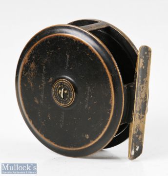 S Allcock & Co stamped Moscrop Manchester 4” patent brake brass fly reel in black finish, screw adjuster to central ventilated faceplate, with ‘S. Allcock & Co Redditch, England, The Moscrop’ inscribed to the backplate, surface wear apparent, runs very smooth otherwise