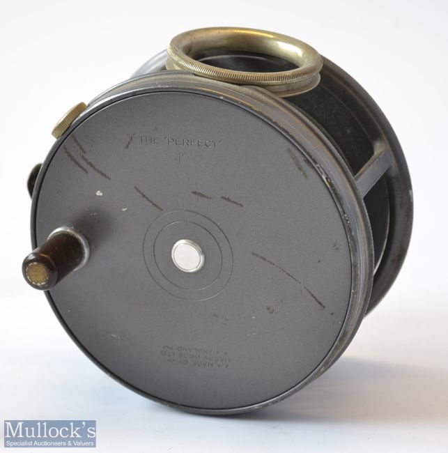 Hardy Bros England The Perfect 4” Alloy Salmon Fly Reel – with lacquered brass ribbed foot, revolving nickel line guide, rim tension adjuster and original black handle – comes with line – retaining much of the original finish