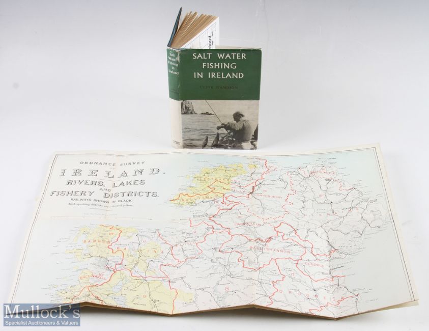 Gammon, Clive – “Salt Water Fishing in Ireland” 1966 first edition, published by Herbert Jenkins, London, with 16 illustrations and map end pages, fine condition in unclipped dust wrapper, plus a 1929 ordnance survey map of Ireland showing rivers, lakes and fishery districts, laid on linen, 28” x 22” (2)