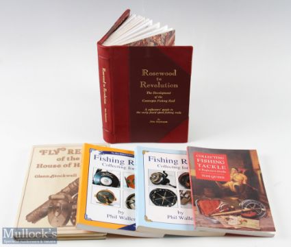 Fishing Reel Reference Books titles include Rosewood to Revolution Signed Ltd Ed in half leather, Fly Reels of the House of Hardy, and Fishing Reels Collecting for all Vols I and Vol II (Signed), plus Collecting Fishing Tackle A Beginner’s Guide – generally G condition overall (5)