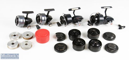 2x ABU 506 closed faced reels and spare spools appear with light surface wear both spin very well, together with 2x Mitchell Garcia 410 fixed spool reels and spare spools with in turning handles, full bail arms, both with signs of surface wear, spin well otherwise (10)