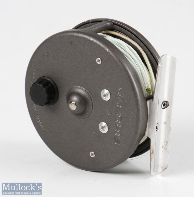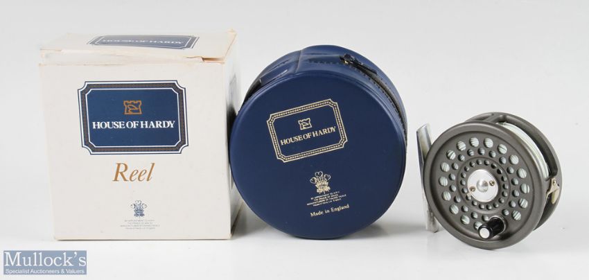 Hardy Bros England Marquis #4 alloy fly reel with smooth alloy foot, line guide, loaded with line, drag adjuster to rear, appears to run smooth, in good condition, with maker’s zip case and card box