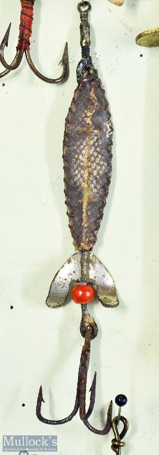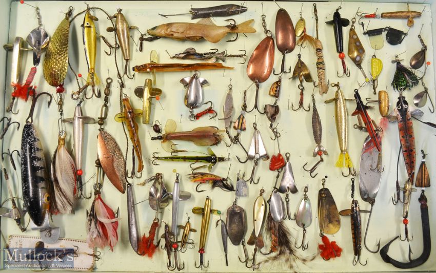 Interesting collection of various fishing lures (65) mounted in a wooden display case. Makers incl W B (Wm Brown), Hardy, Gudebrod Sniper, Canadian Feather Acme Spoon, Geen’s Spiral, Lemax, Gapen’s feather spoon, Excelsior Devon Bait on card, halcyon spinner style, leather Swallow tail, artificial baits, Hardy Reflex, Hardy Swimmer Bait, Holroyd Smith Spinners, rubber fish bait, various otter baits, Hearder Plymouth India rubber Tube/otter bait, various spoons, devons, quills, rooster tail, Colorado, Stucki Special brass and mother o’pearl, stitches fish skin bait et al overall 12” x18”