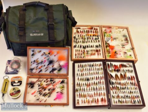 3x Wooden Fly reservoirs featuring a double sided case containing approx. 400 Salmon flies, singles, doubles, trebles, another wooden reservoir with extra tray with Salmon flies approx. 100 and a smaller wooden case with reservoir flies approx. 60 – within Modern Lureflash canvas fishing tackle bag with external pockets and shoulder strap containing line, weigh scales etc – ready to use (4)