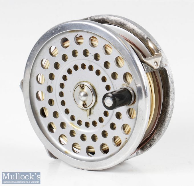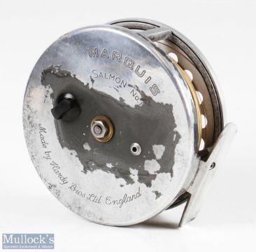 Hardy Bros England Marquis Salmon No1 3 7/8” alloy fly reel and spare spool with smooth alloy foot, U line guide, in silver finish to backplate, surface wear, runs smooth, loaded with line, with canvas zip case