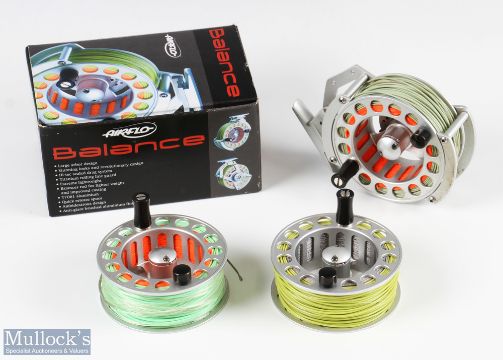 Airflo Balance 7/9 large arbour fly reel in titanium finish, rear drag adjuster, counter weight, loaded with line, plus 2x spare spools in maker’s card box, light use, spins well otherwise