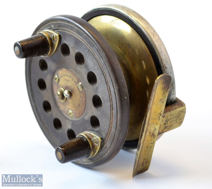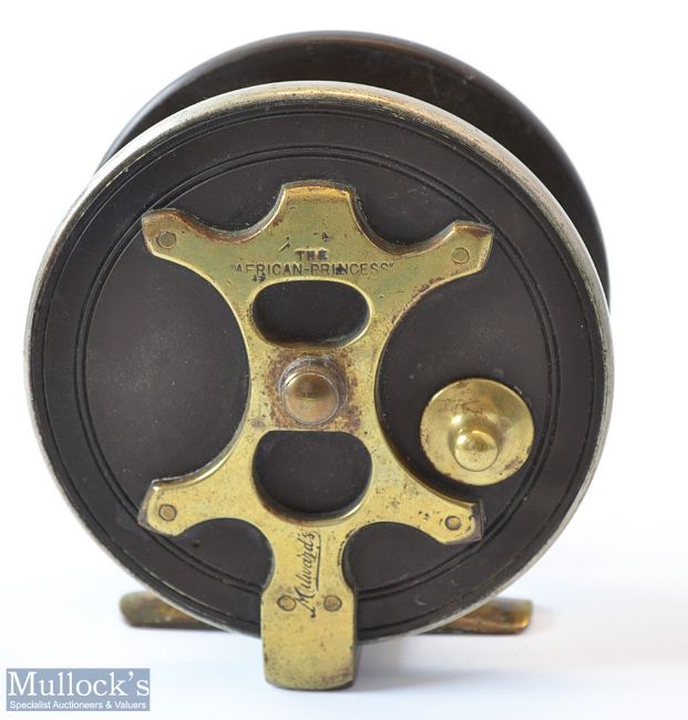 Rare Milwards “The African Princess” ebonite, brass frog back with nickel silver rim 4.25” salmon/sea reel – slater style drum release latch, brass drum core and rear back plate drum flange – on/off check button – spins freely