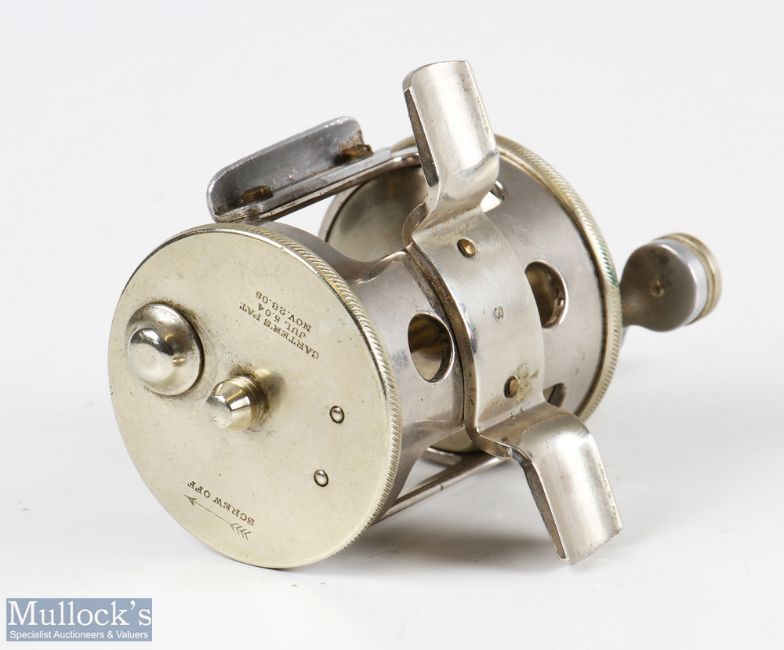 Fine B F Meek & Sons Louisville, Kentucky No33 Blue Grass multiplier reel in nickel silver measures 1 ¾” x 1 ¾” spool width, stamped 3 to bridged foot, stamped Carter’s Pat Jul 5.04 Nov 28.05 to end plate, on/off check, counter balance handle, in very good condition overall, with period leather case