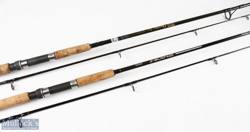 Daiwa Graphite Sensor-Z Spinning Rod, 8ft 2pc 210g, soiled handle in MCB; and Shakespeare Quadra Spin Rod, 2.7m 2pc, 10-30g, soiled handle. (2)