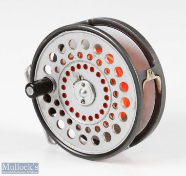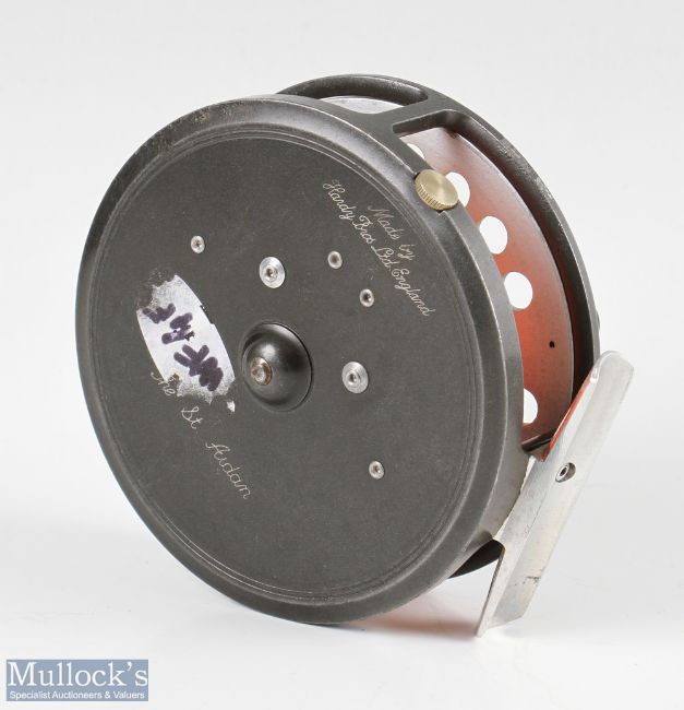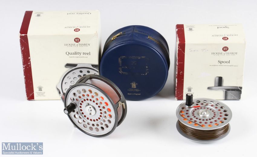 Hardy Bros England St Aidan 3 ¾” alloy fly reel and spare spool with smooth alloy foot, u shape line guide, rim tensioner, light surface wear, runs smooth otherwise – with a maker’s zip case, plus Hardy (Marquis No2 Salmon Reel) box (2)