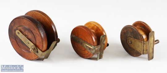 3x Nottingham wood and brass reel incl’ a 4” H. Matcham reel (missing handle), plus a 2 ¾” strapback reel and a 2 7/8” reel A/F