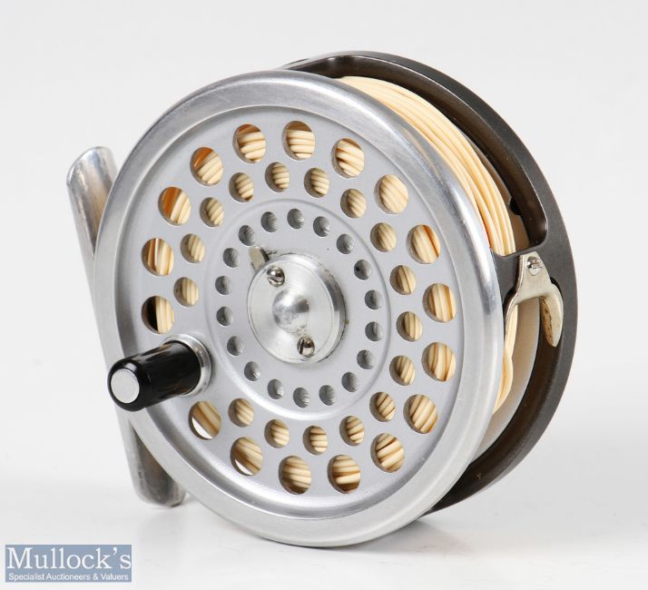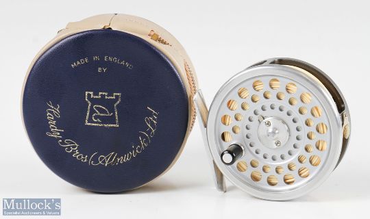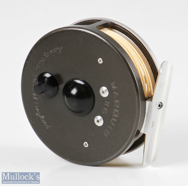 Hardy Bros England Marquis #5 alloy trout fly reel with smooth alloy foot, line guide, loaded with line, in very good clean condition, with maker’s zip case