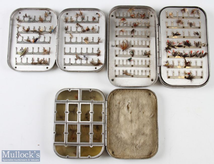 3x Wheatley alloy fly cases/boxes with flies includes a 5” case with hinged compartments internally, a 6” with swing leaf and clips internally and another with clips internally measuring 5”