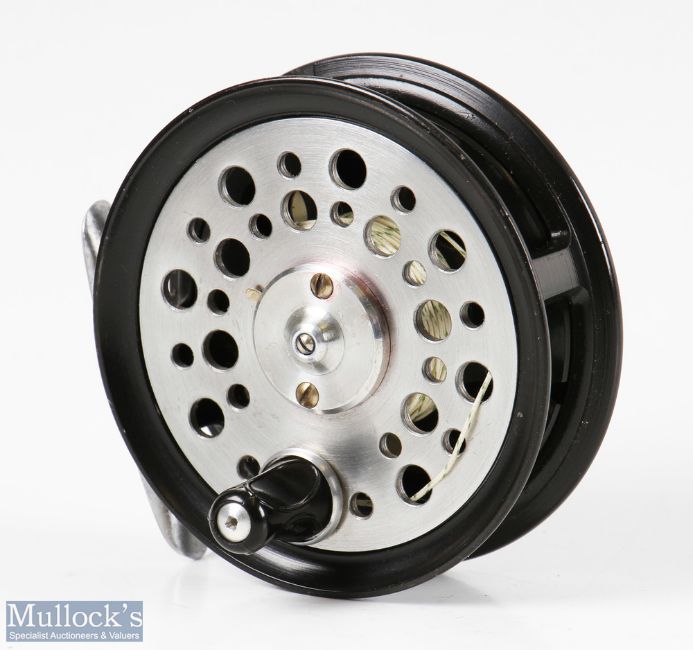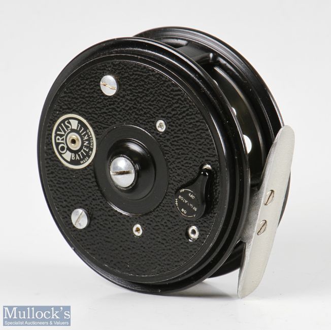 Fine JW Young Orvis Battenkill 3 ¼” alloy fly reel with smooth alloy foot, dimple black handle, mottled black finish, appears in very good condition, with Hardy zip case