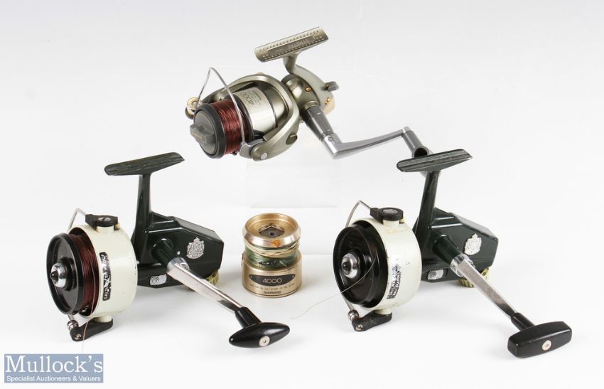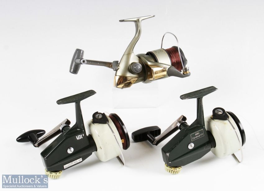 ABU Cardinal 77 fixed spool reels one foot stamped 097006, one foot indecipherable on/off checks, both run smooth, signs of light surface wear, with line, owner’s initials together with a Shimano Symetre 4000FH spinning reel in good condition (3)