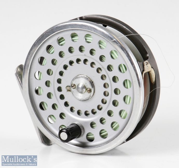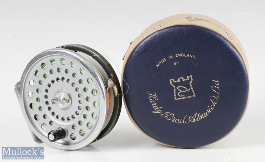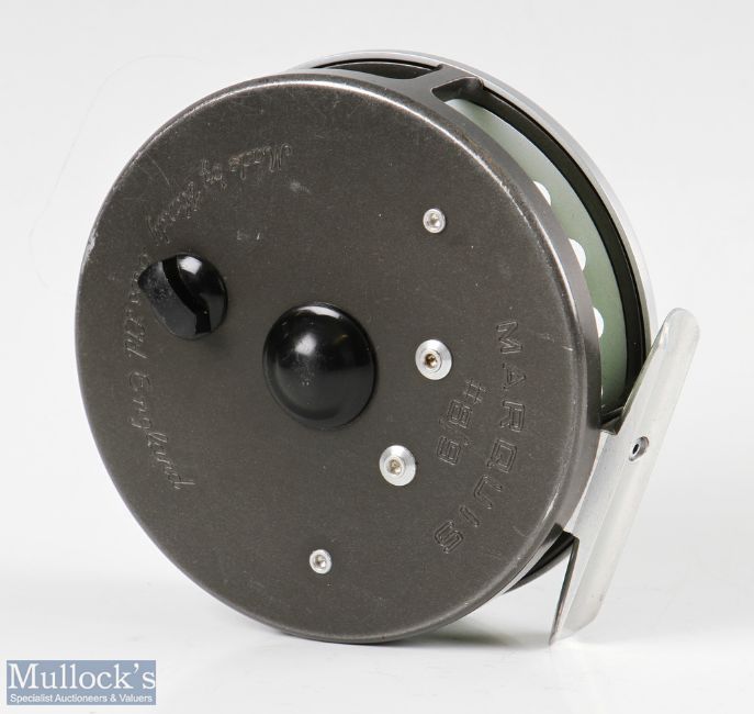 Hardy Bros England Marquis #8/9 alloy trout fly reel with smooth alloy foot, line guide, loaded with line, light signs of use, in very good clean condition, with maker’s zip case
