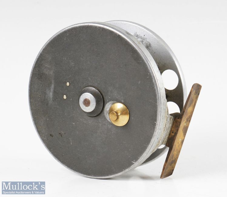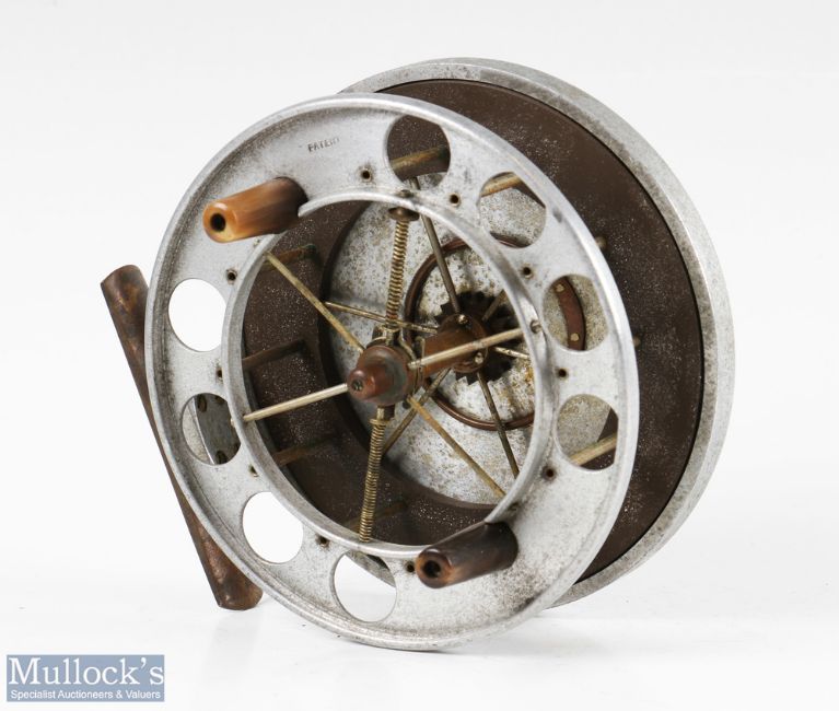 Rare S Allcock & Co 4 ½” Aerial aluminium and ebonite centrepin reel c1910-1914 with ventilated aluminium front flange marked Patent, rear ebonite flange, six spoke with tension regulator, on/off check, gun metal finish backplate, smooth brass foot, spins forever, no cracks to ebonite