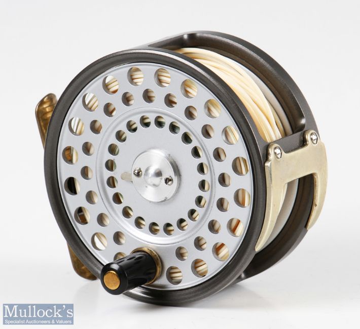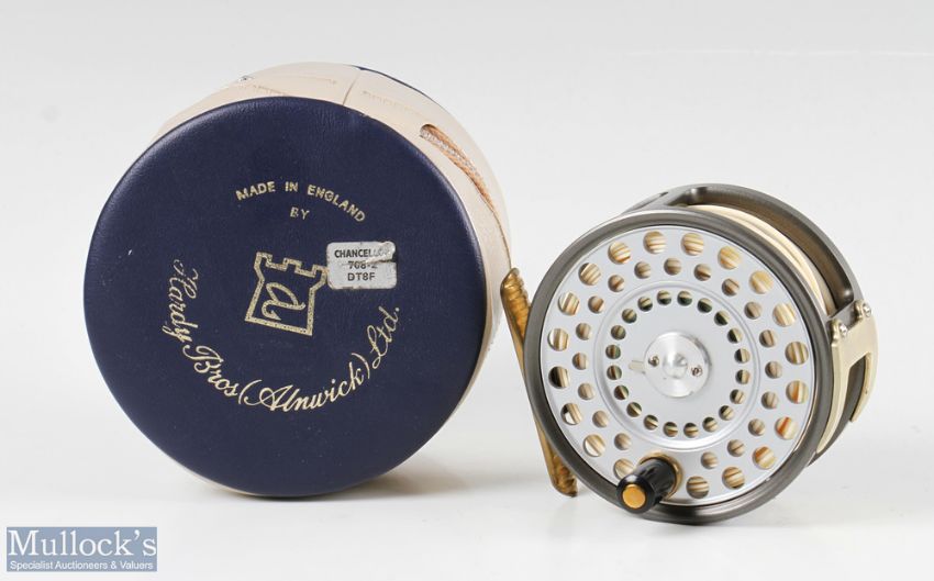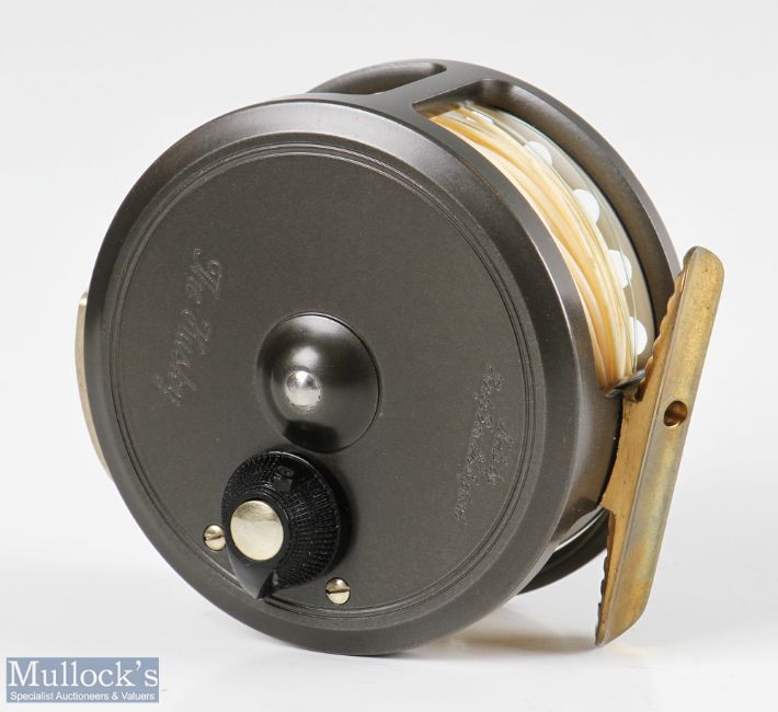 Hardy Bros England The Husky 3 3/8” wide drum alloy fly reel with silent check, ribbed brass foot, U shaped line guide, loaded with line, appears in almost new condition with maker’s zip case