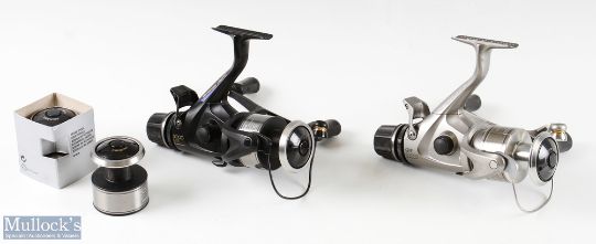 Shimano GTE 5000 and 5000B baitrunner spinning reels and spare spools black and silver examples both with very light signs of use, appears overall in good, clean condition (4)