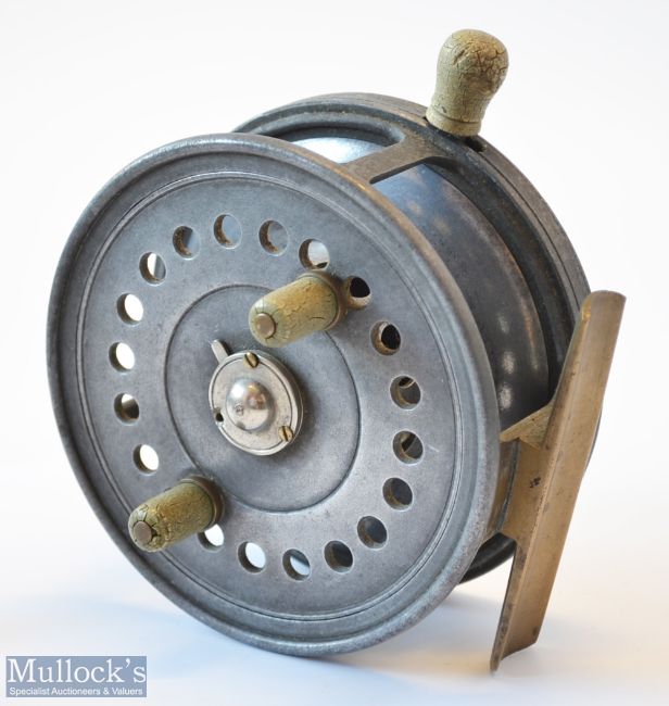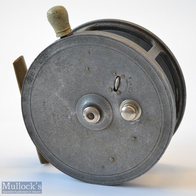 Scarce Reuben Heaton The ‘Bute’ Patent 4.5” Alloy Silex style casting reel – stamped A & W McCarthy Dunedin and Invercargill to the back plate and Patent No 35014, silent check, rim brake and drag controls to back plate, good smooth brass foot – twin crazed ivorine handles ( some very light gnawing), 3x screw drum release latch – one screw missing - runs freely