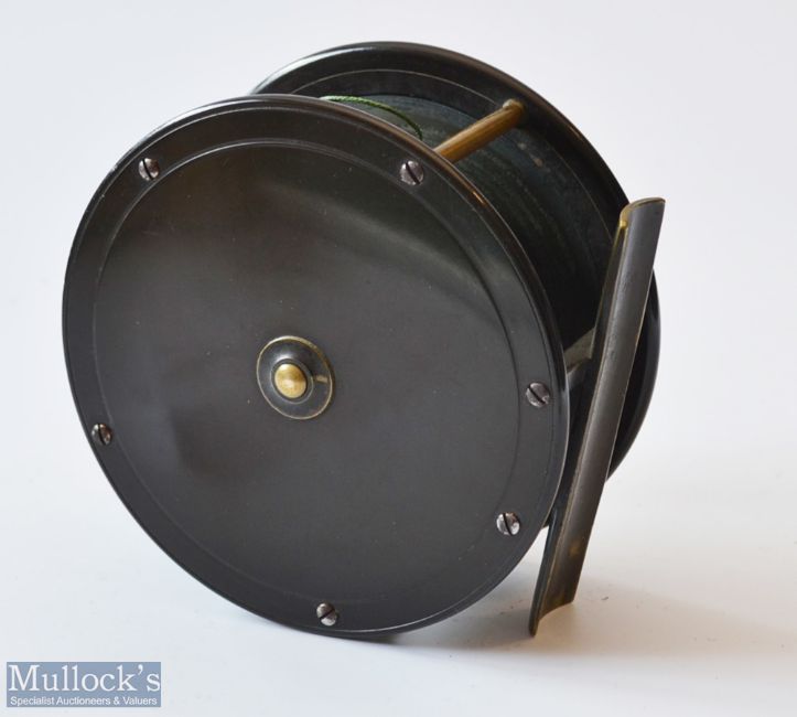 Fine Eaton and Deller Makers 6&7 Crooked Lane London 4.25” Brass and Ebonite Wide Drum Salmon Reel – with makers details engraved to the lacquered brass face plate wind together with name Thomas Faulconer – good storing constant check, straight lacquered smooth brass foot – slight thumb wear close to the winding handle – otherwise very hard to fault – and in the original leather block D shaped reel case with the embossed initials T.F to the lid